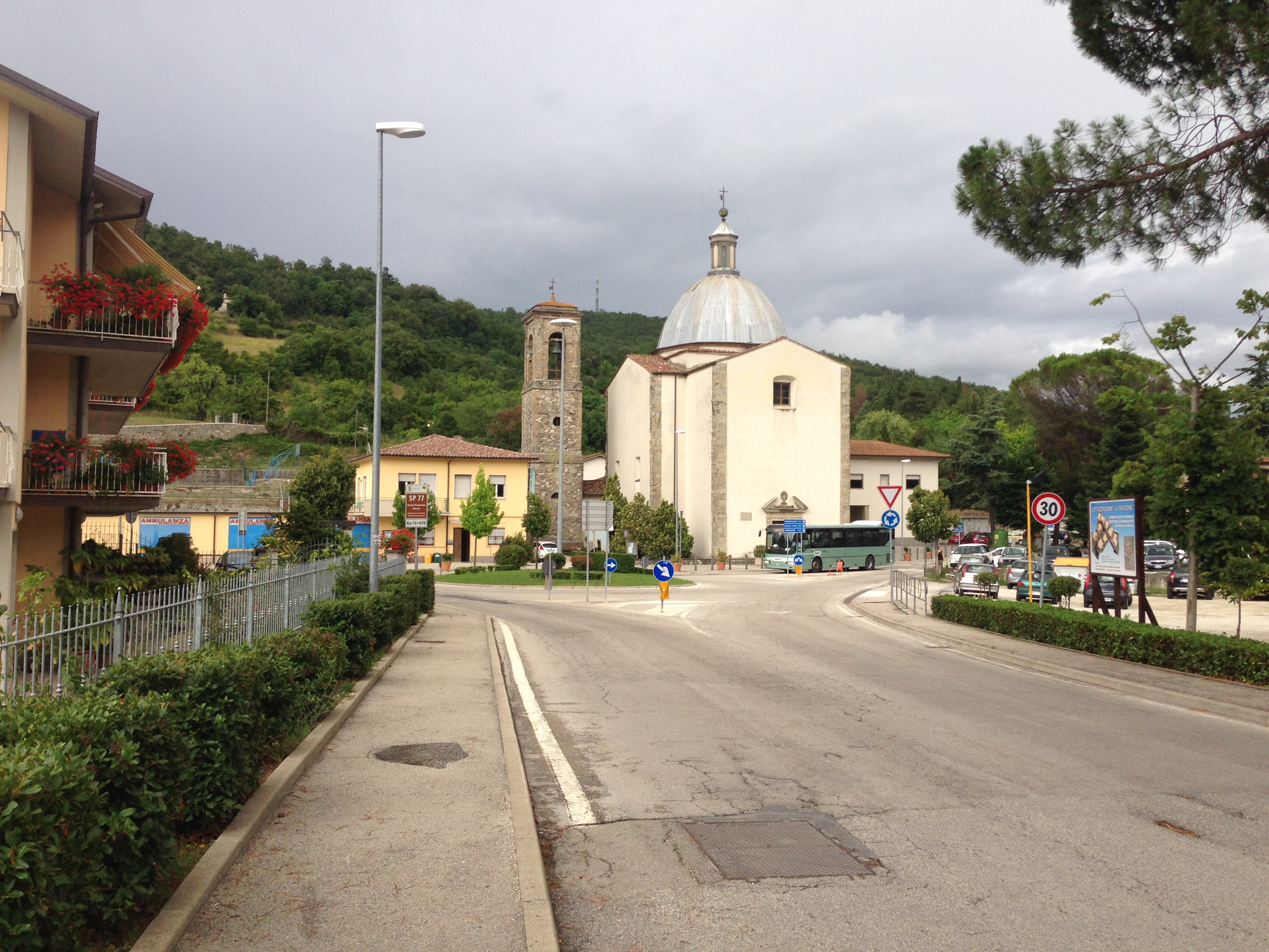 Glede na to, da je Chiusi della Verna na nadmorski višini okoli 900 m, je bilo jasno, da se bom do Pieve S. Stefana, ki je ob avtocesti, na koncu moral spustiti. Ko sem zapustil Verno, sem se kmalu usmeril po kolovozni poti proti vasi Gregnano. Najprej sem se vzpenjal po kolovozu do prelaza. Iz njega pa sem se spustil do vasi. Kolovoz poteka po gozdu, ki raste na tamkajšnih pobočjih. Ko sem se začel spuščati, na ozkem makadamskem kolovozu zagledam ležečo veliko belo kravo. Ko me je zagledala, je nemudoma vstala. Ko sem hotel iti mimo nje, je pospešila korak in me ni pustila mimo. Na tak način sva hodila vsaj 10 minut. Lahko sem jo opazoval, kako uspešno hodi tudi v strme bregove kljub njeni teži. Potem pa prideva še do 2 belih krav, podobne postave in bika. Sedaj so bile vse živali na ozkem kolovozu. Da bi šel mimo njih, če me ne bi spustile, ni bilo možnosti, ker je bila okolica kolovoza gosto zaraščena z grmičevjem, podrastjo in drevjem. Že sem si "belil" glavo, kako bom šel mimo krav. Nenadoma pa so se pognale na kolovoz, ki se je dvigoval v pobočje. S tem so mi odprle nadaljevanje poti. Po kakšnih 2,5 ure hoje sem dospel v Gregnano, ki je vasica, sestavljena iz kmečkih in stanovanjskih hiš. Kmečka posestva poleg pašnikov in gozdov posedujejo še njive, na katerih imajo zasejano pšenico, koruzo ... Kot je značilno za podeželje tega dela Italije so starejše hiše narejene iz kamenja. Novejše pa tudi iz drugega materiala. Nekatere med njimi, imajo pred hišo tudi bazen. Sledil je vzpon po asfaltni cesti do vasi Montalone. Vzpon je trajal več kot 1 uro. Tu sem pa zavil proti Pieve Santo Stefanu. Na začetku spusta, sem si ogledal tudi vaško pokopališče. Pot se je najprej strmo spuščala. Potem pa je strmina nekoliko popustila, kar se je zgodilo pred vasjo Mignano. Od tu sem se mimo pašnikov, kjer so se pasle ovce, spustil do že večkrat omenjenega mesta. Pieve Santo Stefano je manjše mestece, v katerem si lahko ogledamo nekatere kulturne znamenitosti, kot so cerkve, spomenik posvečen žrtvam 1. svetovne vojne ... Kraj ima poleg živilske trgovine še nekaj trgovin različnih strok, gostilne, hotel, kmečki turizem ... Skozenj pa teče tudi reka Tevere. Pred vstopom v mesto, sem si lahko ogledal zanimiv plakat, ki je vabil k obisku kmečkega turizma.