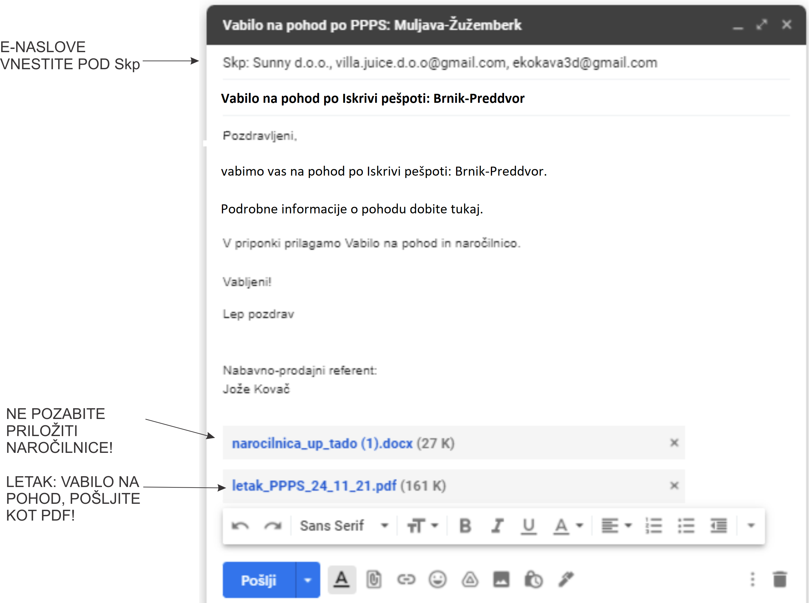 e-pošte. b. Iz registra izberite učna podjetja po Sloveniji (kliknite tukaj), katerim ste določili vstopno postajo v Googlovih zemljevidih glede na številko vašega računalnika. c. Kako napisati e-sporočilo za pohod po Iskrivi pešpoti po Gorenjski (kliknite tukaj).