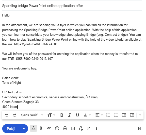 AAI) račun. 2. naloga: Na svoj računalnik shranite Sparkly bridge PowerPoint za namizje & online, ki ga dobite tukaj. 3. naloga: Naložite vaš pripravljeni PowerPoint iz 3. naloge v oblak 365 (https://365.sckr.si) Narediti morate prijavo AAI. Nastavite ga skupno rabo. Dodelti mu tudi geslo za odpiranje, da bomo nadzirali plačilo aplikacije, ki ga bodo izvedle stranke. Kako to narediti, kliknite tukaj? 5. naloga: Izdelajte kalkulcijo za aplikacijo Sprarkly bridge PowerPoint online (klinite tukaj). 6. naloga: Izdelajte letak za prodajo aplikacije: Sparkly bridge PowerPoint online. Osnutek letaka dobite tukaj. Shranite ga na vaš računalnik. V letak zapišite vaše cene, ki ste jih izračunali v Excelu. 7. naloga: Na svoj računalnik shranite angleško naročilnico (kliknite tukaj), ki jo boste priložili vaši e-pošti poleg letaka.