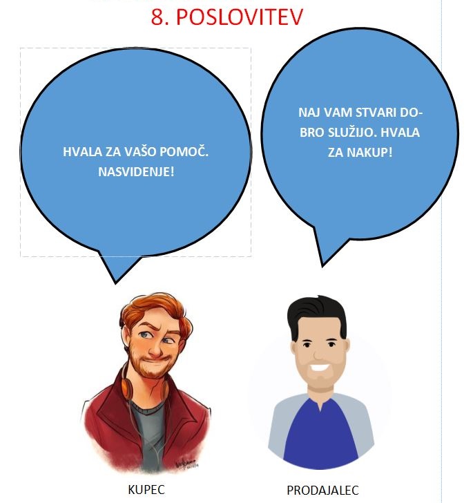 Pohvalimo kupčevo odločitev, opozorimo na navodila za uporabo in vzdrževanje, poudarimo druge koristi, pozdravimo kupca ter se zahvalimo za nakup. |